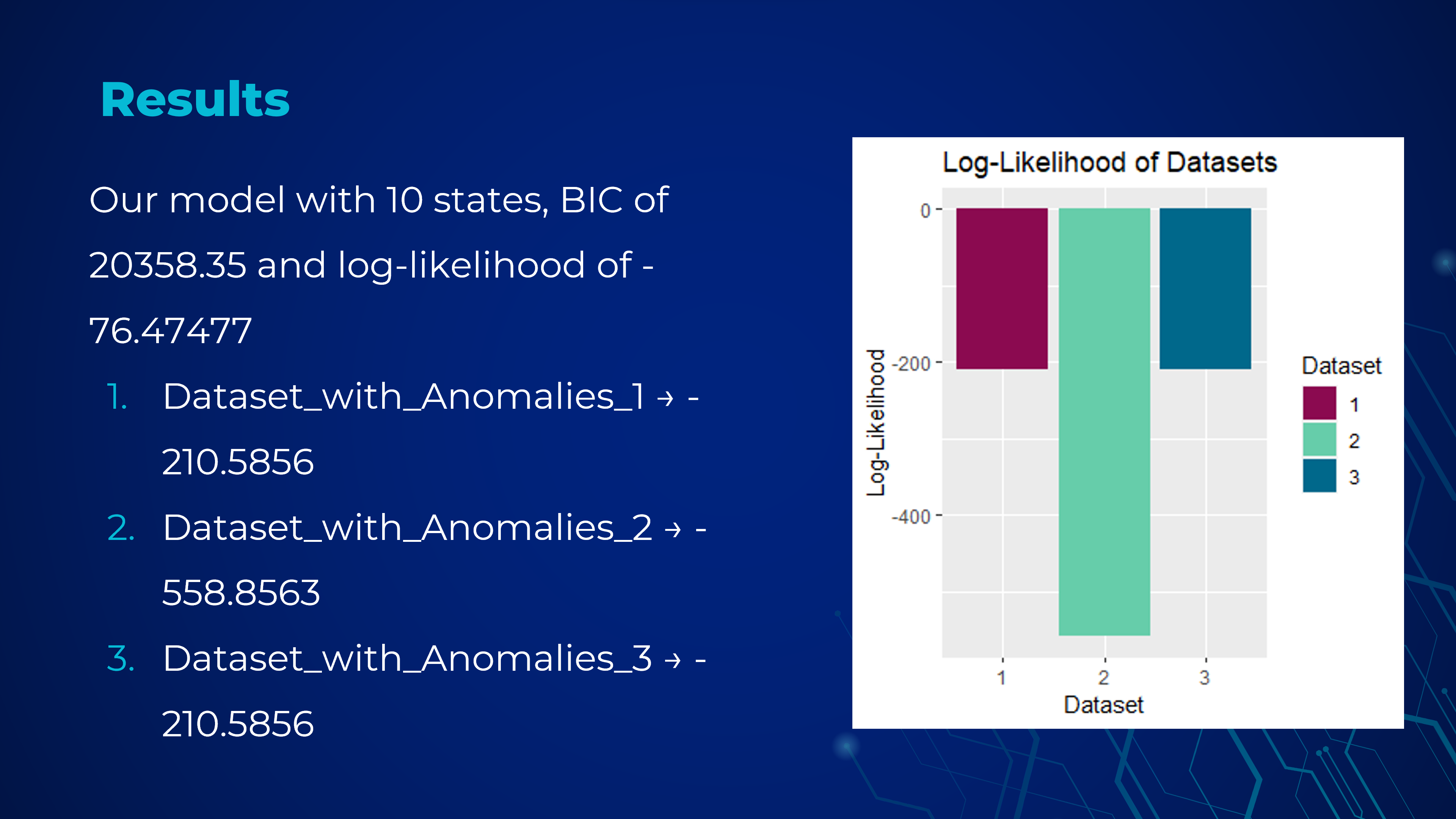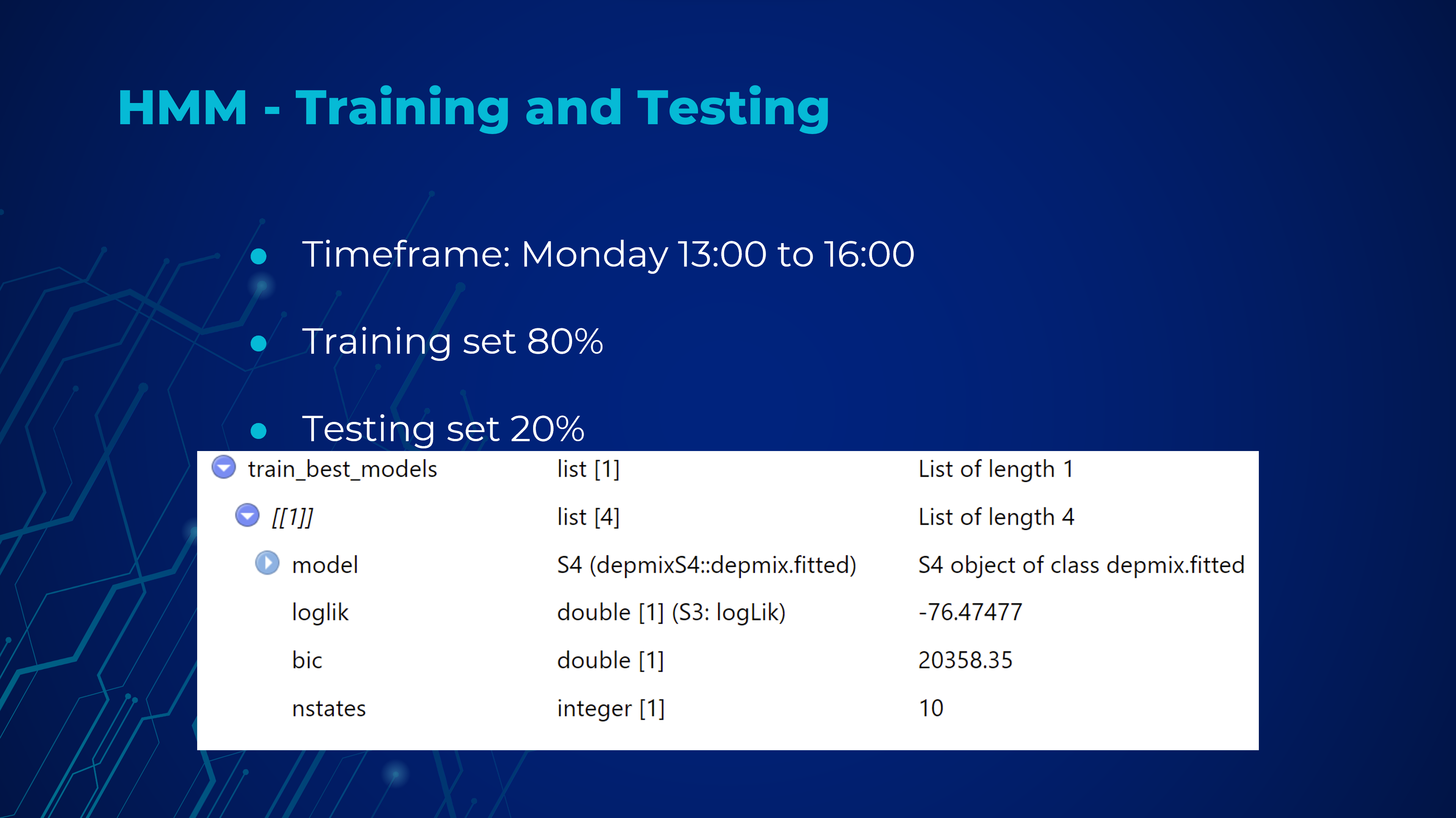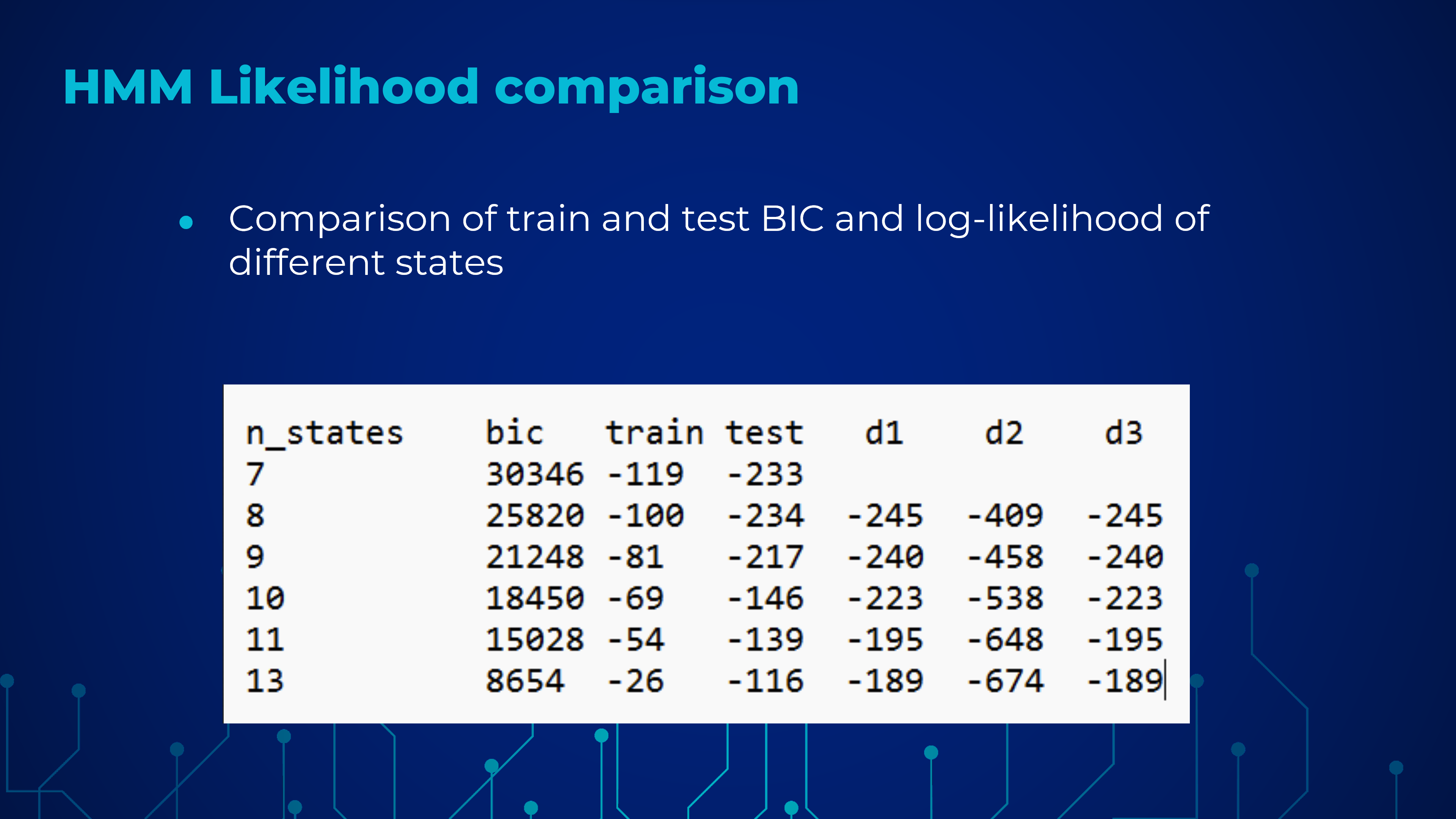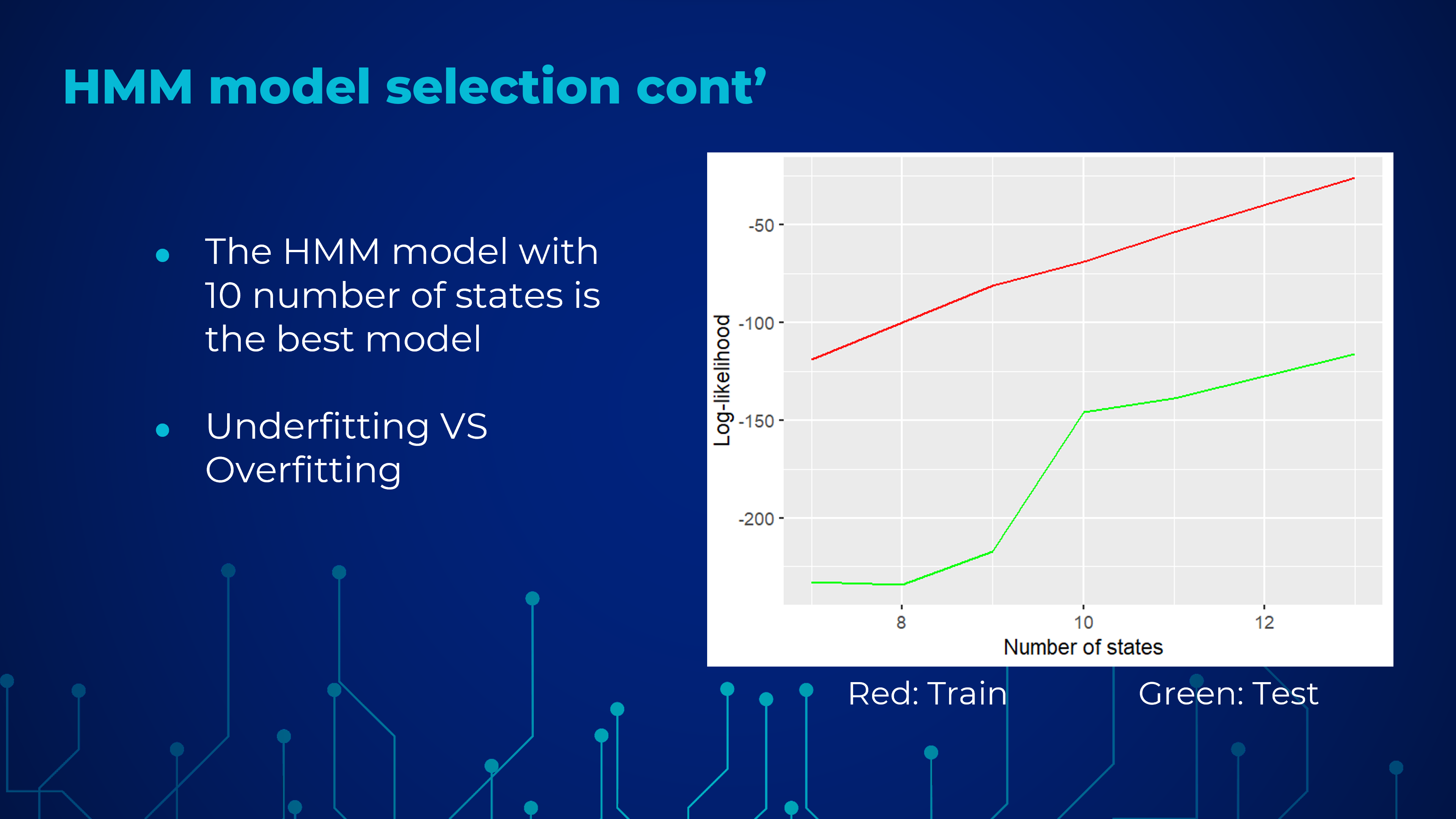 training and optimizing the HMM model, and evaluating its performance based on Log Likelihoods and