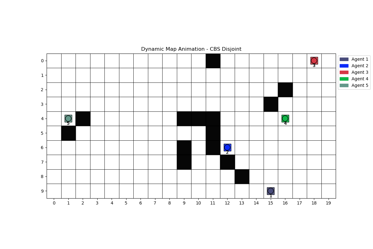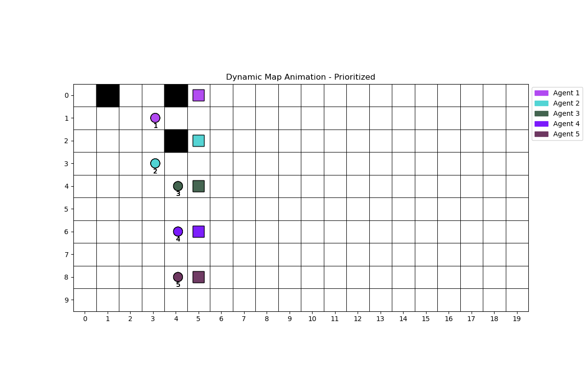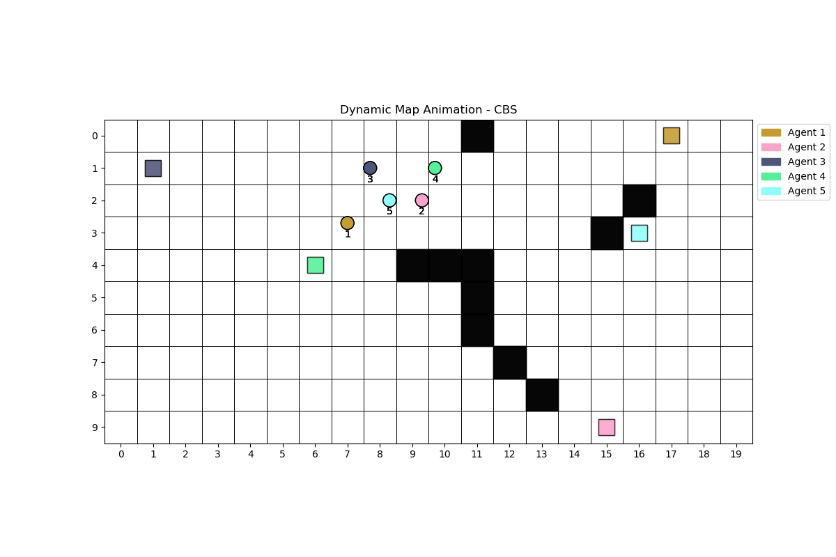 This project explores Dynamic Multi-Agent Pathfinding (MAPF), where agents navigate a changing environment with dynamic obstacles and goals.